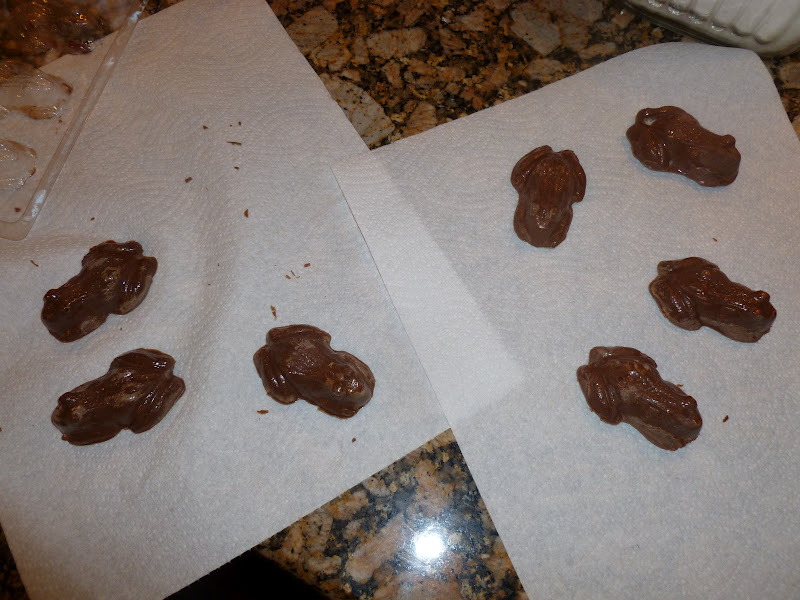 4. Before unmolding the toads, I recommend placing the whole thing in the freezer for a minute or two. It really makes the candy much easier to pop out. Unmold the toads and Enjoy!